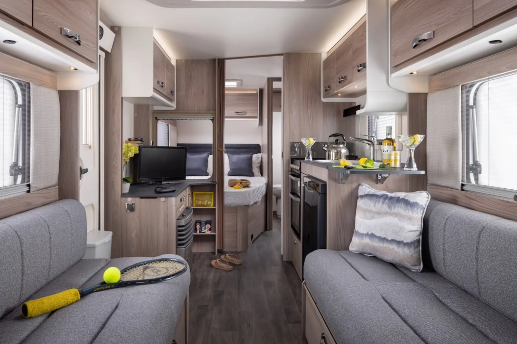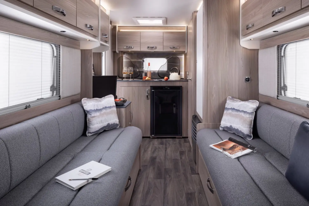 Alle Mondial-modeller er desuden udstyret med komfortable sofaer, der indbyder til afslapning. Mondial SE byder på et elegant og rummeligt køkken med et eksklusivt komfur med gasovn og grillfunktion. Ultra Heat, dobbelte USB-udtag og radio med Bluetooth gør det nemt at skabe den rette stemning til hyggelige aftener. Det moderne, lyse interiør med hvide køkkenoverskabe giver en åben og indbydende rumfornemmelse.
